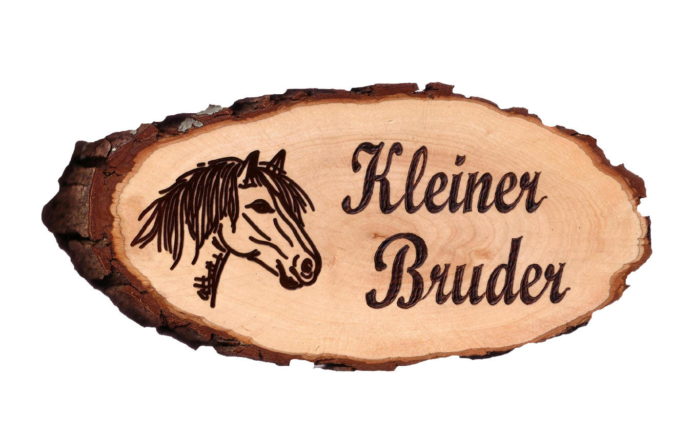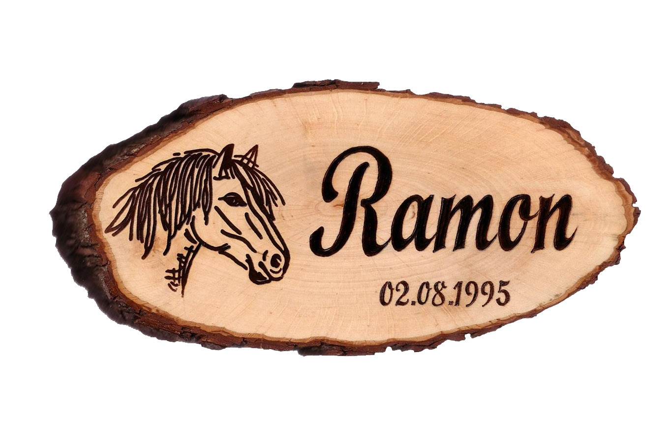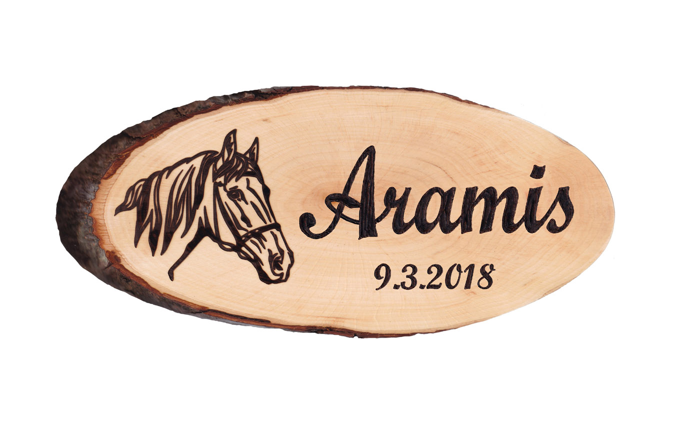Wir fertigen rustikale Namensschilder für Pferde und Ponys aus Baumscheiben.
